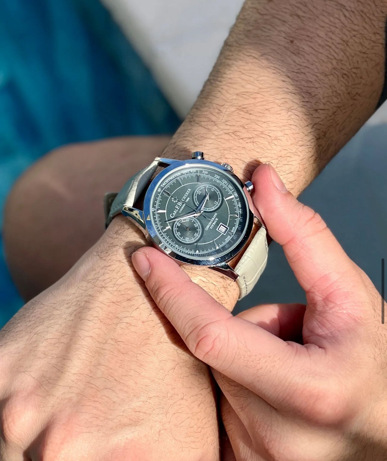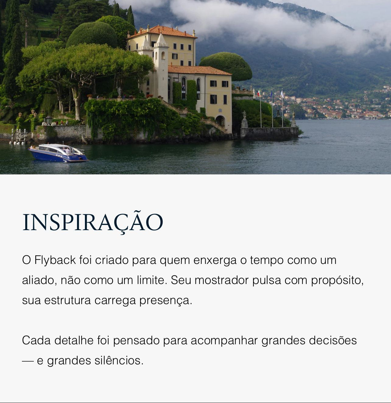 O Flyback tem algo distintamente único para oferecer aos amantes de relógios: o sofisticado movimento de cronógrafo com função flyback. Ele permite que o usuário registre tempos consecutivos com o menor intervalo possível entre eles. Os ponteiros do cronógrafo voltam a zero, enquanto o movimento continua a funcionar em segundo plano, permitindo que os ponteiros sejam retomados assim que o botão de reinicialização for liberado.